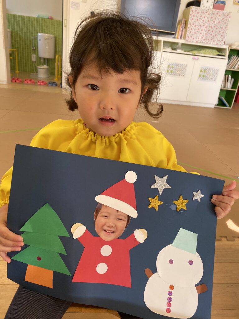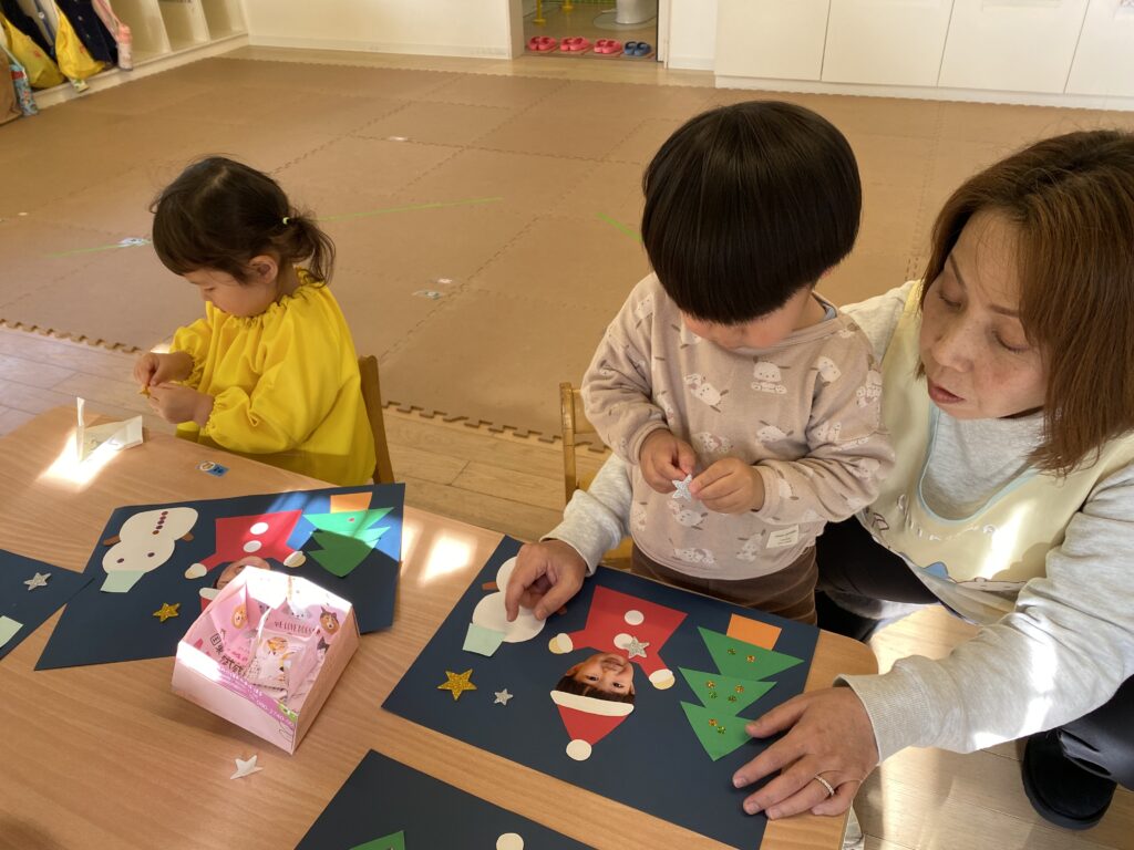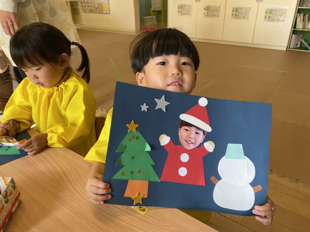 色画用紙にツリーや雪だるま、自分の顔写真にサンタカラーの帽子や服を自由に貼って