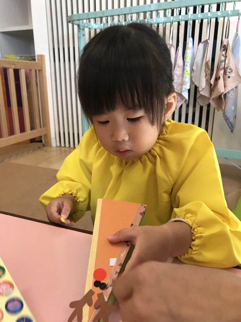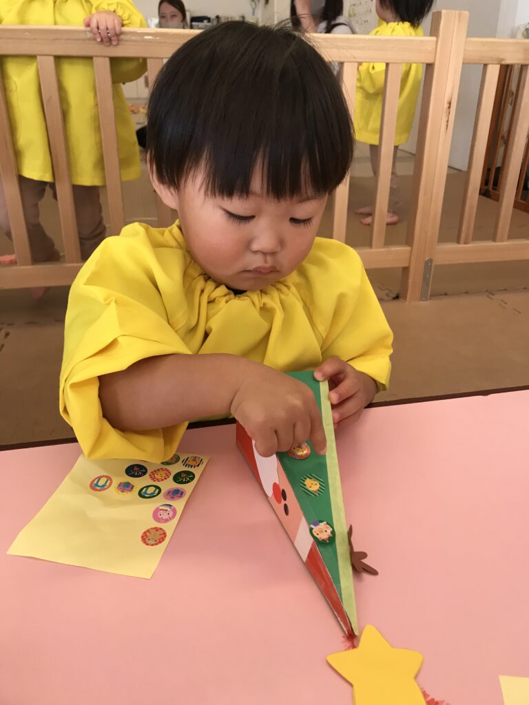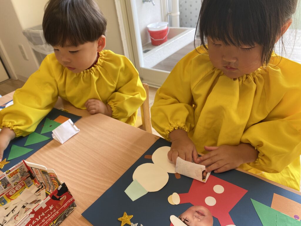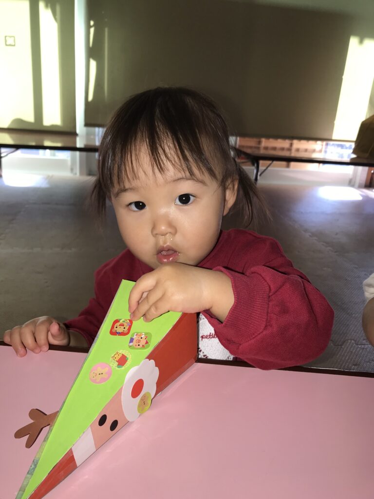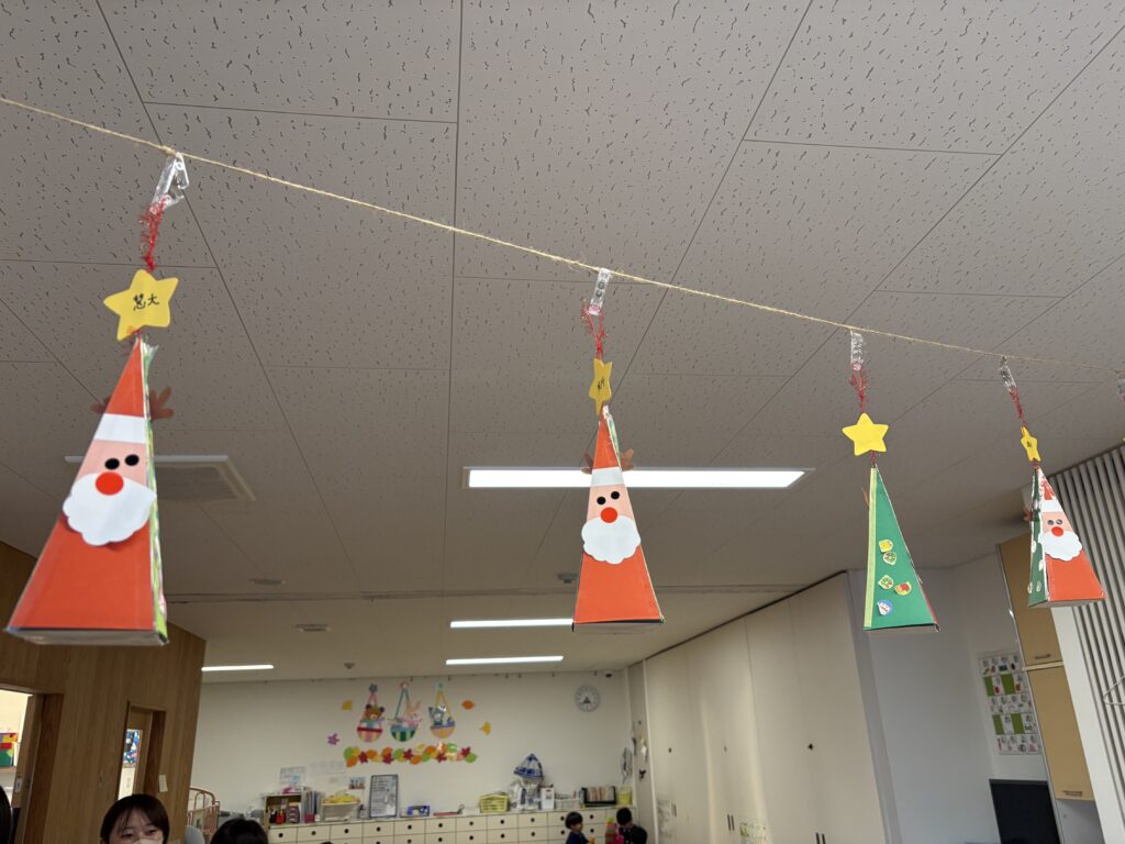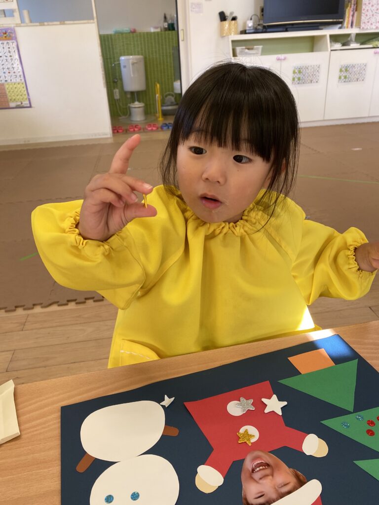 すみれ組さんは角錐の面にサンタやトナカイの顔を貼り、