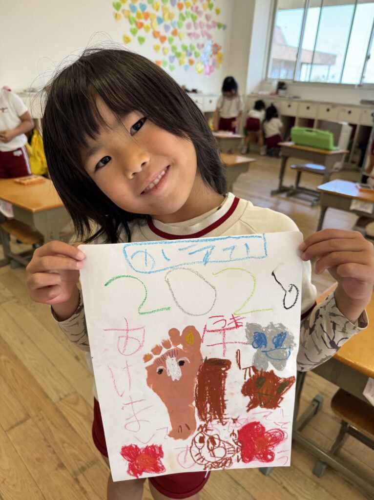 ほら!この年賀状のでき具合、どう?😀 足形を干支🐴に変身!